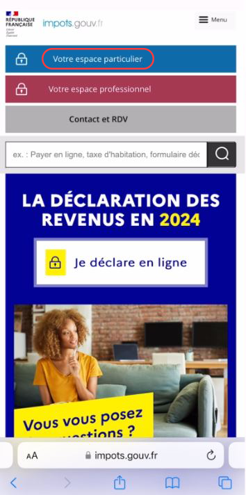 RDV sur le site impots.gouv.fr et cliquez sur « Votre espace particulier ».