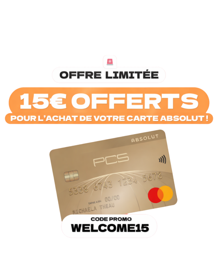 *Mentions légales L’offre promotionnelle 1 carte PCS Absolut achetée = 15 € offerts proposée par PCS Mastercard est valable du 1er avril au 30 avril inclus. Cette offre est strictement réservée aux 500 premiers clients éligibles. Description de l’offre : Les nouveaux clients peuvent bénéficier de 15 € offerts crédités sur leur compte pour tout achat d’une carte PCS Absolut (embossée) entre le 1/04/2026 et 30/04/2026, sous réserve du respect de l’ensemble des conditions définies ci-dessous avant le 10/05/2026. Conditions d’éligibilité Pour bénéficier de l’offre, le client doit impérativement : Achat d’une carte PCS Absolut embossée (personnalisée), saisir le code promotionnel WELCOME15 au moment de l’achat, créditer sa carte PCS Absolut avec un montant minimum de 50 €, effectuer au moins une transaction avec la carte PCS Absolut, finaliser la procédure de vérification d’identité (KYC) avec un statut validé à 100%. Modalités d’attribution du bonus La somme de 15 € sera créditée uniquement après validation de toutes les conditions citées ci-dessus. Le versement de 15 € pourra intervenir jusqu’à 10 jours après la fin de l’offre suivant les délais de traitement. Toute tentative de fraude, de contournement ou d’utilisation abusive entraînera la nullité de l’offre. Restrictions Offre limitée à une seule participation par personne (même nom, même adresse, même identité vérifiée). Non cumulable avec toute autre offre promotionnelle en cours. Offre non échangeable, non remboursable et non transférable. Responsabilité Creacard se réserve le droit de : modifier, suspendre ou annuler l’offre en cas de force majeure ou de nécessité opérationnelle, refuser l’attribution en cas de non-respect des conditions ou de doute fondé sur l’éligibilité du participant.