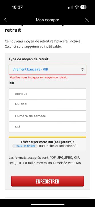 Scrollez la page et ajoutez votre nouvel IBAN PCS dans la section “Mise à jour de mon moyen de paiement”.